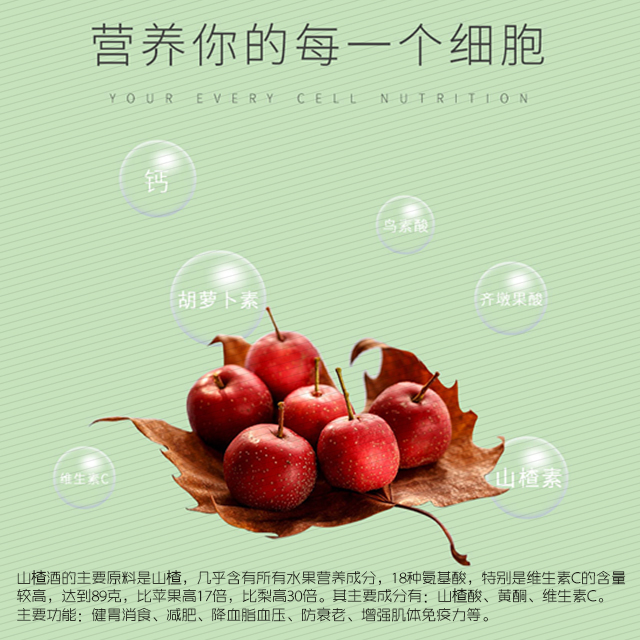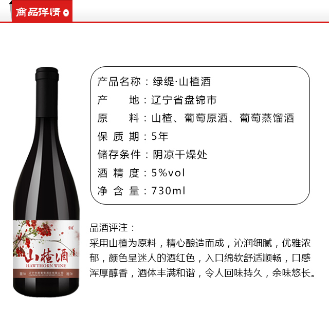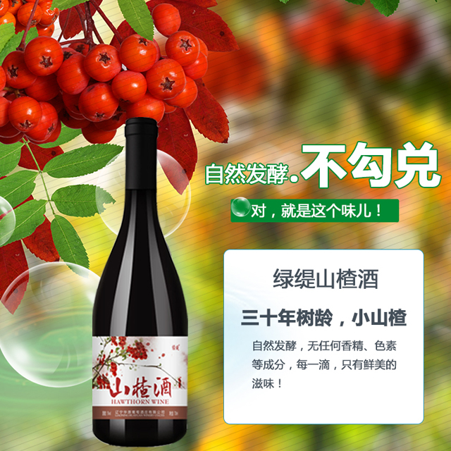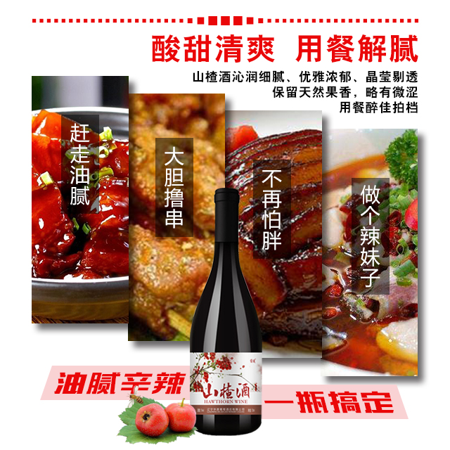 采用山楂为原料,精心酿造而成,沁润细腻,优雅浓郁,颜色呈迷人的酒红色,入口绵软舒适,口感浓厚醇香,酒体丰满和谐,令人回味持久,余味悠长。