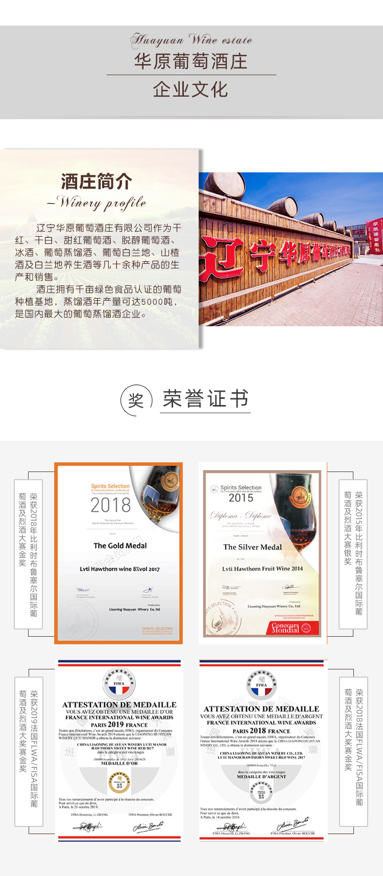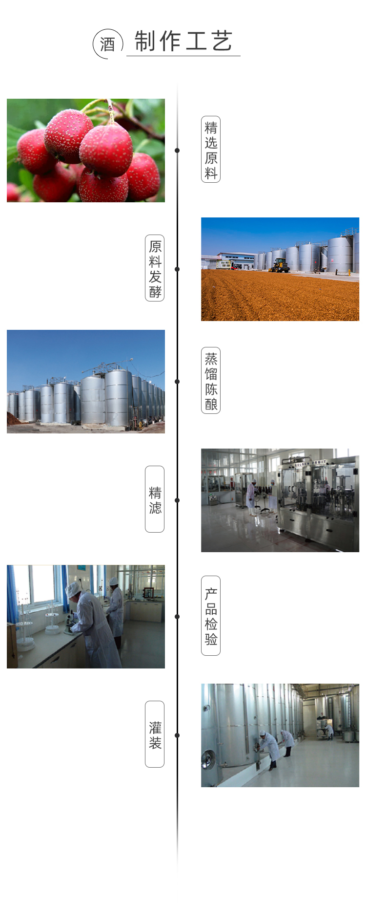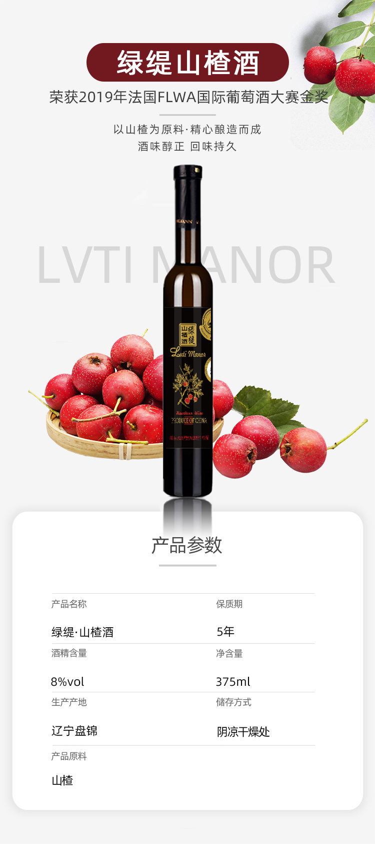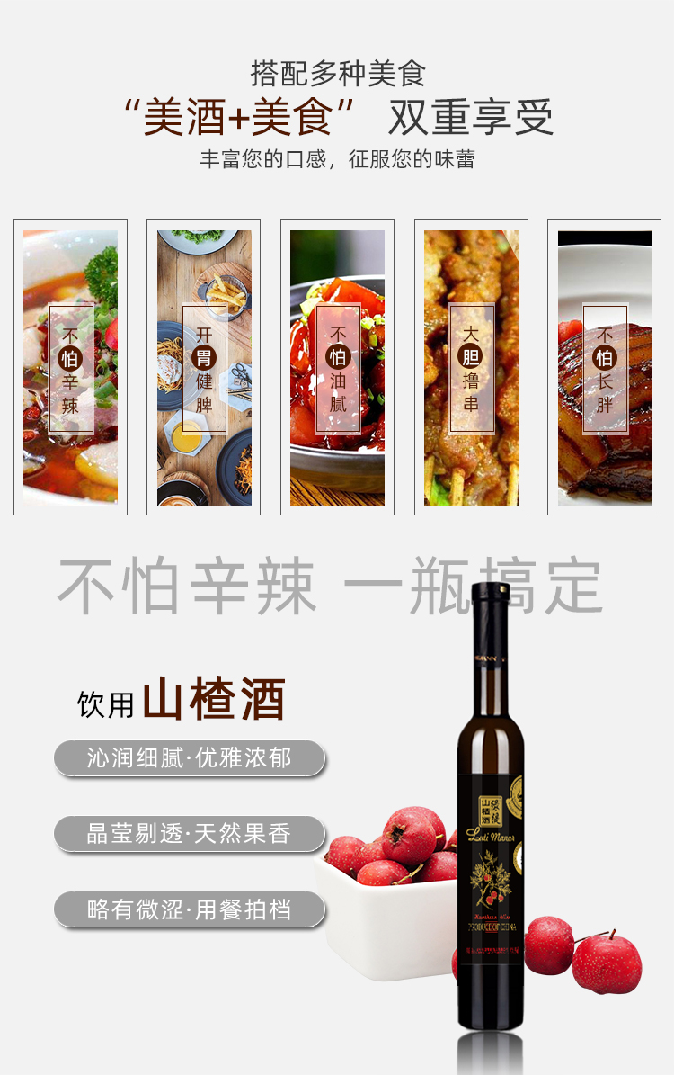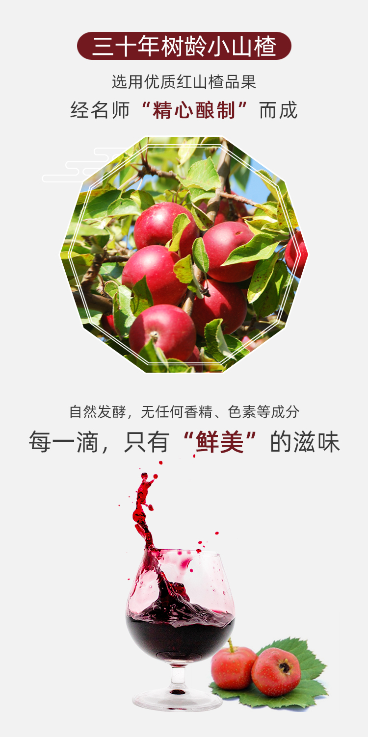 本品以野生小山楂為原料,採用傳統古法工藝發酵精釀而成,顏色呈迷人的酒紅色,澄清透明,具有濃郁的山楂果香,沁潤細膩。