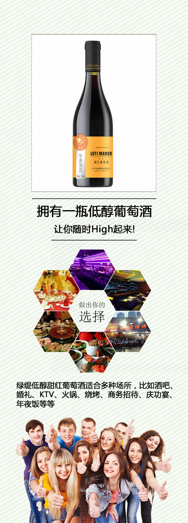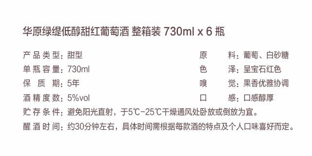 顏色呈寶石紅色,果香優雅協調,口感醇厚。 綠坭低醇甜砵酒適合多種場所,比如酒吧、婚禮、KTV、火鍋、燒烤、商務招呼、慶功宴、團年飯等