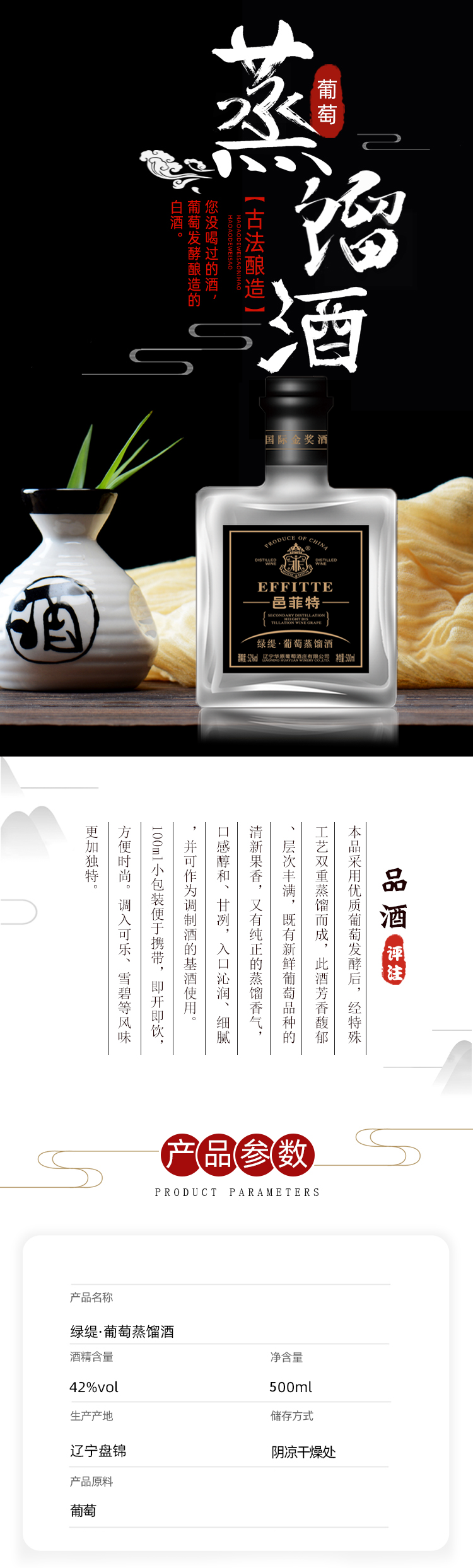 本品採用優質葡萄發酵後經特殊工藝雙重蒸餾而成此酒芳香馥郁、層次豐滿,既有新鮮葡萄品種嘅清新果香又有純正嘅蒸餾香氣,口感醇和、甘冽入口沁潤、細膩,並可作為調製酒嘅基酒使用100ml細包裝便於攜帶即開即飲,方便時尚調入可樂、雪碧等風味更加獨特。
