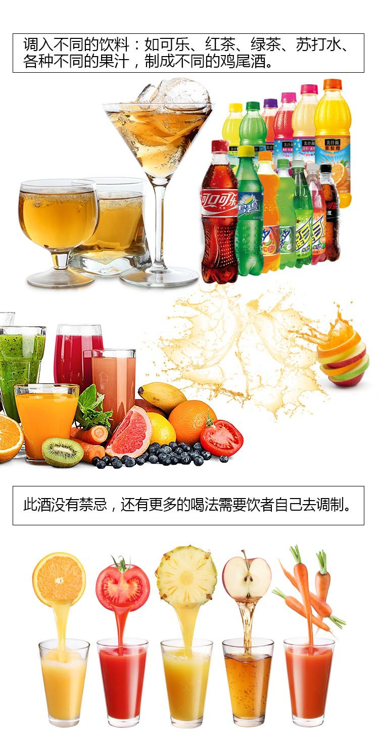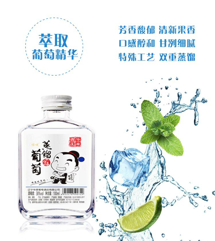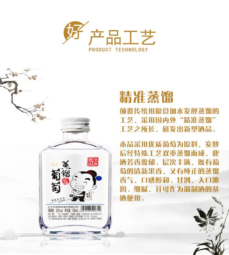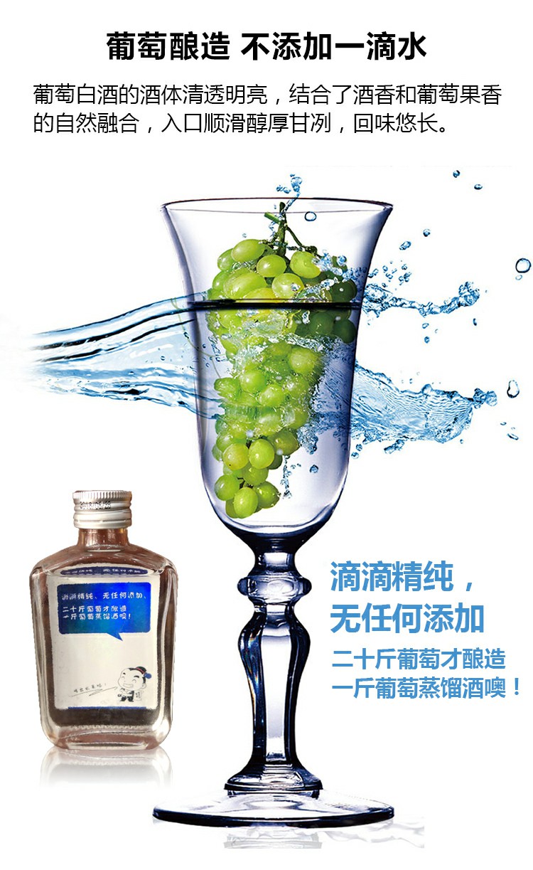 本品採用優質葡萄發酵後經特殊工藝雙重蒸餾而成此酒芳香馥郁、層次豐滿,既有新鮮葡萄品種嘅清新果香又有純正嘅蒸餾香氣,口感醇和、甘冽入口沁潤、細膩,並可作為調製酒嘅基酒使用100ml細包裝便於攜帶即開即飲,方便時尚調入可樂、雪碧等風味更加獨特。